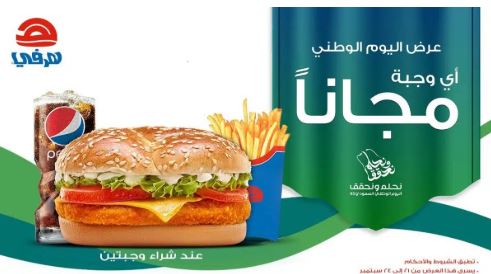 عرض خاص اليوم الوطني | أي وجبة مجاناً عند شرائك وجبتين | من خلال فروع هرفي حصرا | مجانية والعرض مستمر من 21 سبتمبر 2025 حتى 24 سبتمبر 2025 |