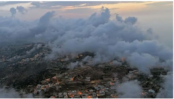 فقد غمرت الغيوم والضباب الكثيف القرى الجبلية والطرقات الوعرة، لتتحول القمم العالية إلى فضاء ساحر يمزج بين هدوء الطبيعة وروعة العمران.
